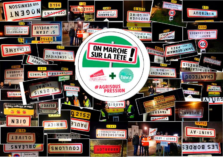 Mobilisation « Pas de transition sous pression ! ». Ce mot d'ordre national a guidé l’action des réseaux JA Loiret et FNSEA 45 dans la nuit du 21 au 22 novembre. Sur tout le territoire, les adhérents des deux syndicats sont allés retourner les panneaux d'entrée des trois quarts des communes loirétaines pour porter un message symbolique : « On marche sur la tête ». À travers cette action, ils ont appelé à une véritable respiration normative et une vraie vision d'avenir pour l'agriculture.