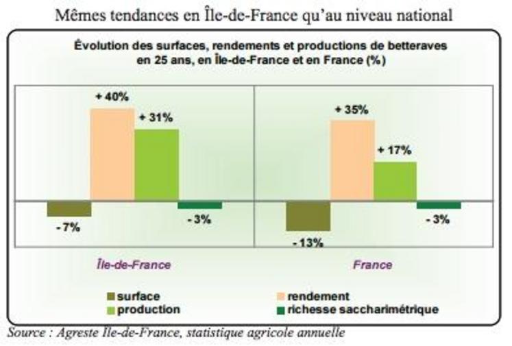 Au nord, deux régions agricoles regroupent 24 % des surfaces de betteraves : Goële-et-Multien en Seine-et-Marne (6 200 ha) et le Vexin en Val-d’Oise (3 600 ha). Au sud, trois régions concentrent 27 % des surfaces : le Gâtinais entre Seine-et-Marne et Essonne avec (5 700 ha), la Beauce entre Essonne et sud Yvelines (3 700 ha) et le Bocage gâtinais en Seine-et-Marne (1 600 ha).