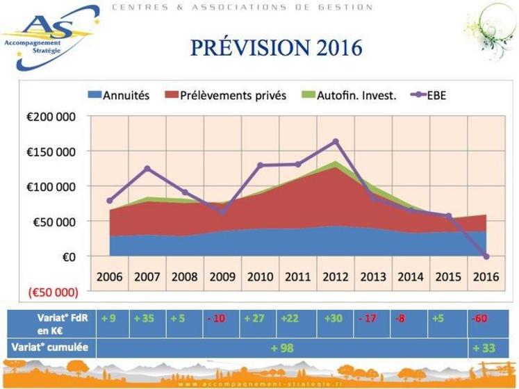 L’excédent brut d’exploitation (EBE) est nul, de sorte que le fonds de roulement va être réduit de 60 000 euros par cette seule année ; ce qui représente une perte de près des deux tiers de ses gains observés depuis 10 ans (98 000 euros).