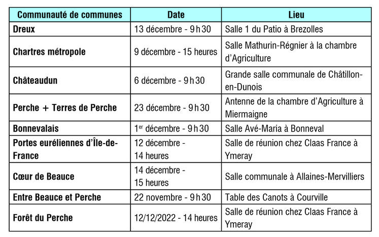 Le secteur de la com-com Entre Beauce et Perche (Courville/Illiers) ouvrira le bal de ces réunions hivernales mardi 22 novembre (voir tableau ci-dessous). Les adhérents ont reçu une invitation et peuvent s'inscrire auprès de la FNSEA 28 pour participer au déjeuner. FNSEA 28