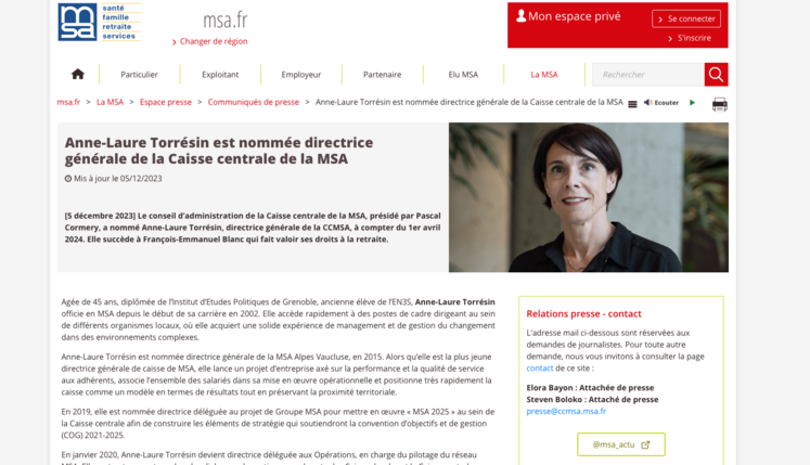 « Depuis 2019, Anne-Laure Torrésin a œuvré à une nouvelle culture de pilotage du réseau, avec une efficacité qui est sa marque de fabrique. Elle a en outre joué un rôle déterminant dans les négociations de la dernière COG, en assurant le pilotage technique. Dans le cadre de ses nouvelles fonctions, elle sera notamment chargée de finaliser puis lancer le projet stratégique MSA 2030, de veiller au bon déroulement des élections MSA 2025 et de négocier avec l’État la prochaine COG 2026-2030.