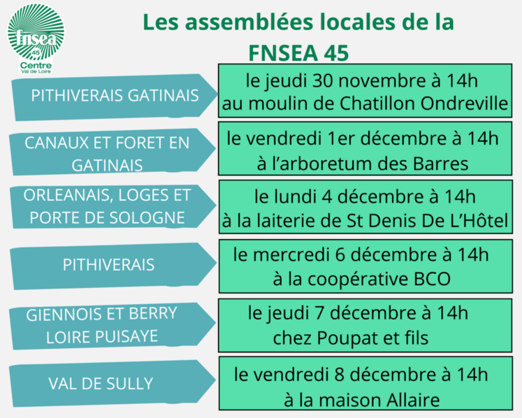 À partir du 30 novembre, les assemblées générales des syndicats locaux de la FNSEA 45 sont de retour. Onze réunions pour s’informer, partager et créer un moment de convivialité.
