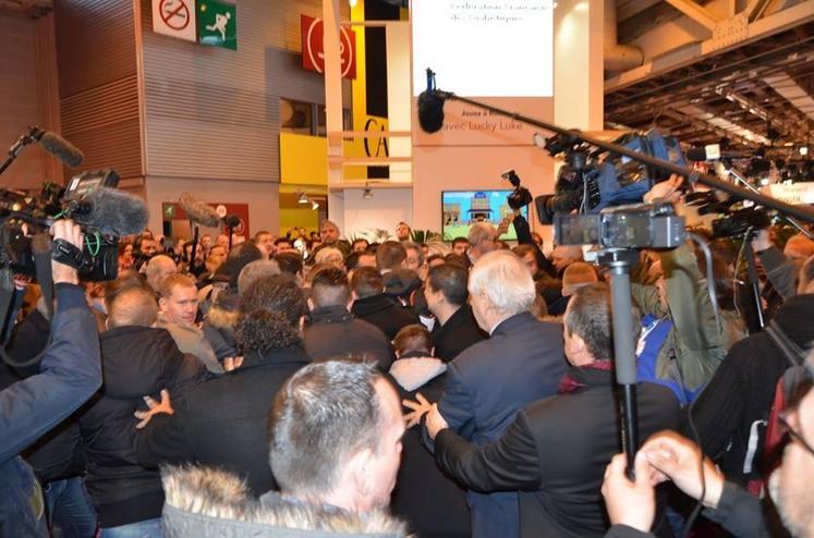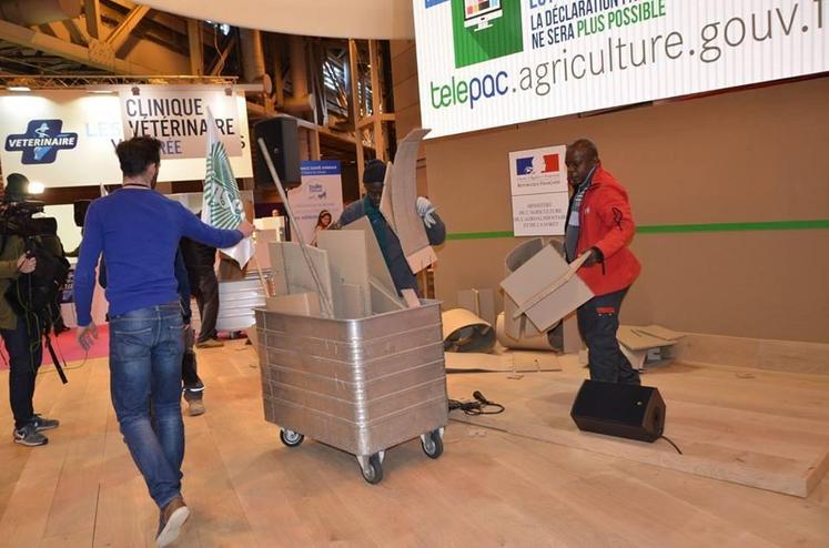 Sous les sifflets, ils ont entrepris de démonter et vider le stand du ministère de l’Agriculture, situé dans le hall 4. Une manifestation s’est ensuivie (voir notre vidéo).