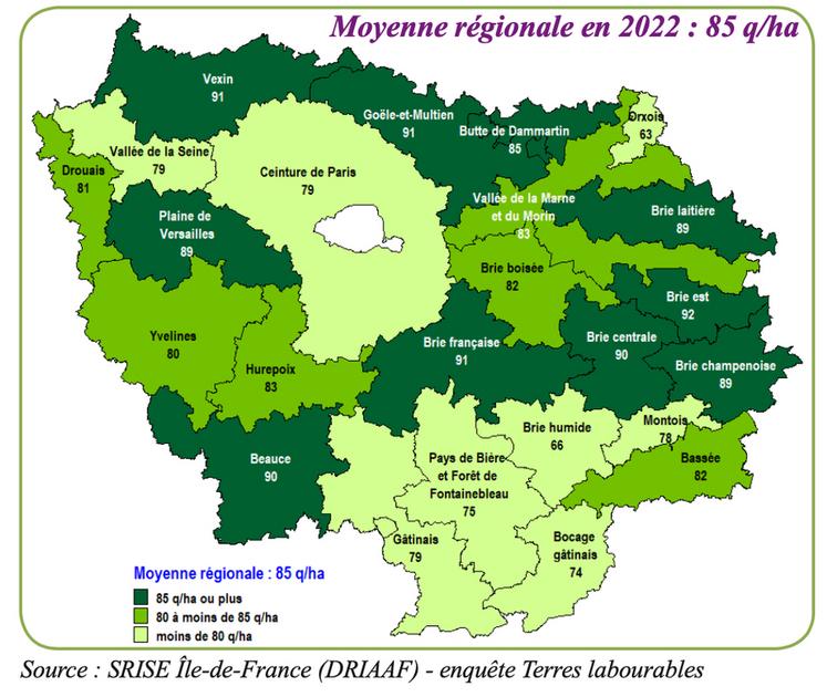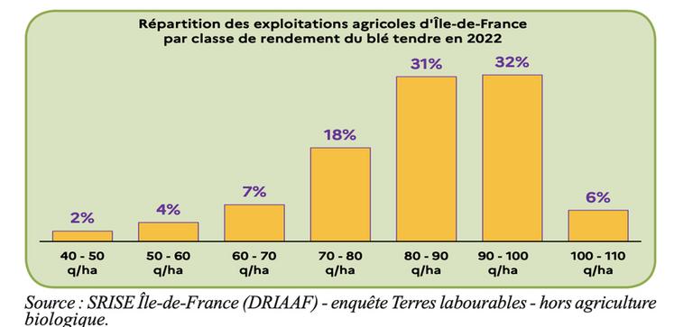 « À 85 q/ha, le rendement moyen du blé tendre francilien se situe dans le trio de tête des régions françaises, derrière les Hauts-de-France et la Normandie », précise d'abord le rapport qui indique que ce bon résultat quantitatif, couplé à une qualité satisfaisante, cache toutefois une hétérogénéité liée aux stress hydrique et thermique durant cette campagne agricole.