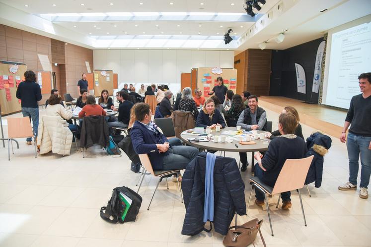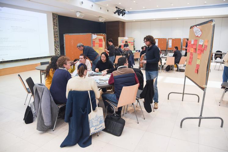 Réunis par huit autour de grandes tables rondes, une trentaine de citoyens et d'acteurs professionnels des secteurs concernés, planchent quelques heures sur les objectifs du futur Projet alimentaire territorial (PAT) de Chartres Métropole, le 5 avril à Chartres.