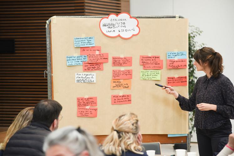 Après une présentation du diagnostic initial sur le système alimentaire de la communauté de communes, quatre ateliers sont organisés sous la houlette d'animateurs de l'agence rémoise AgroSolution. Le premier, bien produire, se donnait pour objectif de réfléchir aux moyens de créer des filières, de redynamiser l'élevage, d'accompagner la transition agroécologique ou de préserver l'emploi agricole.