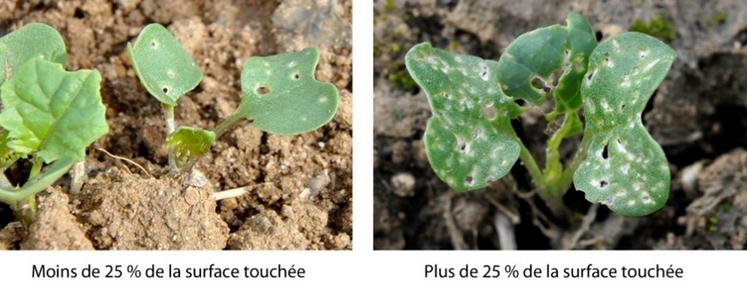 Cette année, les morsures d’altises sont observées dans plus de 80 % des parcelles des réseaux BSV (Bulletin de santé du végétal) du Nord-Est de la France. Ces dégâts sont causés par les petites et grosses altises qui sont actuellement bien visibles dans les parcelles et dont leurs captures en cuvettes jaunes sont plus ou moins importantes.