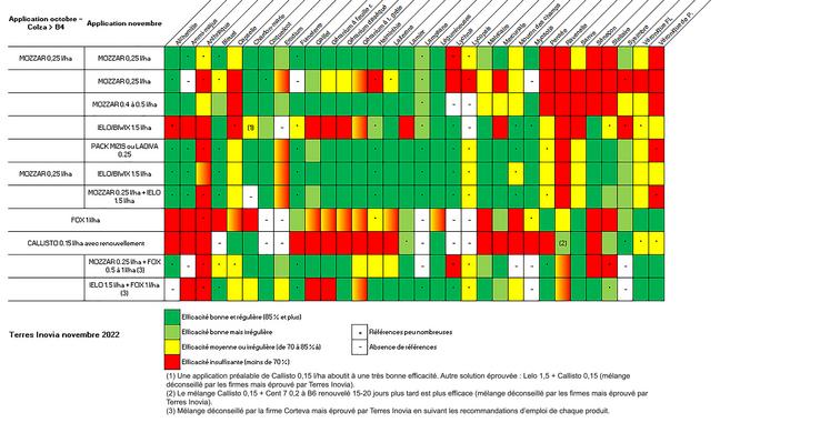 Les rattrapages ou les compléments effectués en post-levée du colza s’appuient évidemment sur un tour de plaine. De nombreuses mauvaises herbes pourront être contrôlées avec les produits de post-levée : Mozzar/Belkar, Pack Mizis, Ladiva, Fox, Callisto, Atic Aqua, Ielo, etc. En séquence ou en association, ces produits sont des atouts et permettent d’adapter les choix aux flores réellement présentes, à condition de bien examiner les situations et connaître les spectres de ces solutions.
