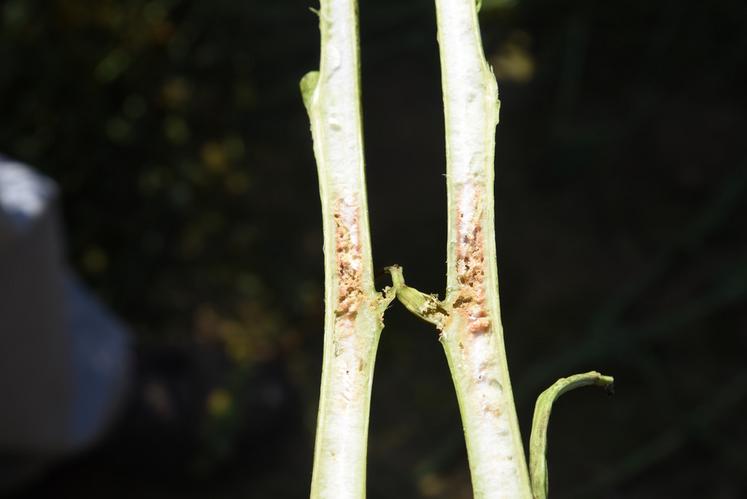 Sur la partie technique, trois thématiques sont développées dans ces essais : le bore, les biostimulants (lire ci-dessous) et la problématique insectes. Celle-ci est sans conteste la plus préoccupante pour l'avenir de la culture. « Cette année ici, il y a pas mal de larves de grosses altises et de charançons du bourgeon terminal (CBT) sur la bande non traitée. Mais si l'on suit le protocole, on ne doit pas avoir ce problème », relève Dominique Delaunay.
