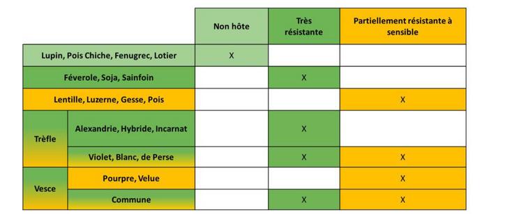 Pour Aphanomyces euteiches, le délai de retour de la lentille préconisé est d’au moins cinq ans. La sensibilité à ce ravageur des autres légumineuses est également à prendre en compte. Les autres cultures sensibles à ces pathogènes (pois, luzerne, certains trèfles…) sont également à prendre en compte dans la rotation :