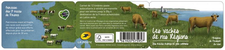 En plein durant le Salon de l’agriculture, La Poste émet un carnet de timbres valorisant les races bovines peu connues en France. Celles que l’on appelle chez les techniciens, les races à faible effectif. Parmi elles, on trouve l’Armoricaine sur fond de côtes bretonnes, la Pyrénéenne casta (qu’on appelle aussi race bovine d’Aure et de Saint-Girons), la blanche Mirandaise et la noire Bordelaise, les jolis noms de maraîchine ou de ferrandaise, etc. En tout, si on compte la couverture du carnet, treize races sont représentées pour cette édition.