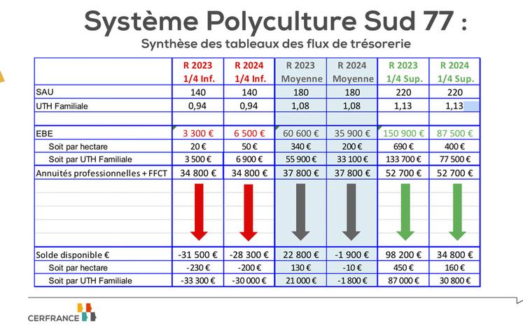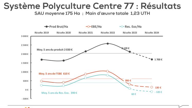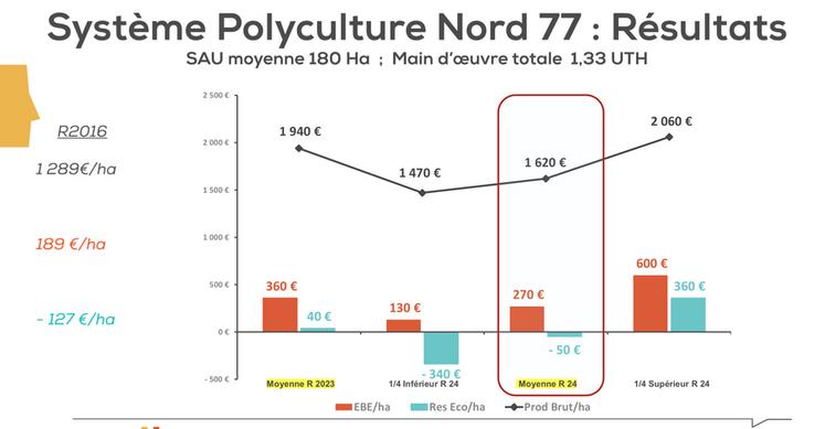 Plus précisément, les exploitations agricoles en système de polyculture du nord-Seine-et-Marne voient leurs produits baisser de 16 % à 1 620 e/ha, pour un EBE (Excédent brut d’exploitation) de 270 €/ha (- 25 %). La baisse du prix des engrais a permis de maintenir un EBE positif mais la hausse des frais financiers et des amortissements engendre un résultat négatif (- 50 €/ha contre 40 €/ha l’an passé).