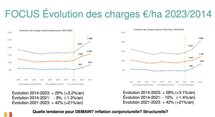 Si l’évolution globale des charges en 2023 par rapport à 2022 est de 5 % à l’instar de l’inflation, elle s’élève à + 10 % voire plus pour les postes réparation, entretien du matériel, semences et phytosanitaires, et celui des engrais et amendements explose (+ 50 %), après avoir déjà fortement augmenté lors de la récolte 2022. Ces évolutions engendrent un surcoût du poste engrais d’environ 25 000 euros en moyenne pour les exploitations, soit à titre d’exemple 40 à 48 euros/tonne de blé.