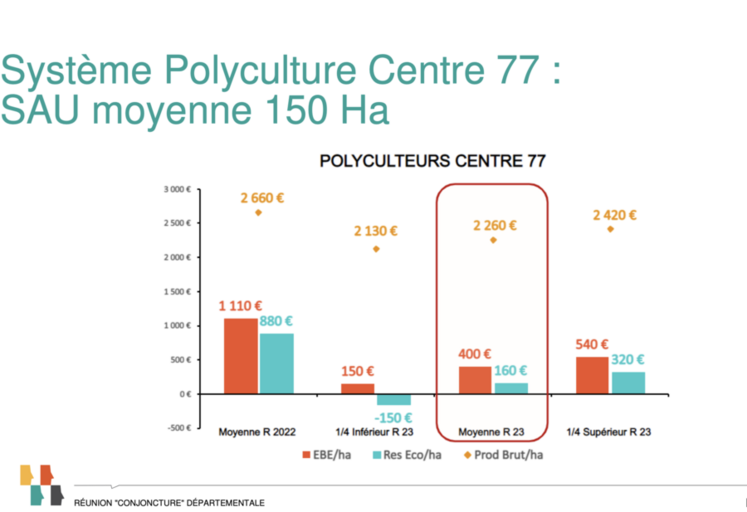 Concernant les exploitations de polyculture du centre-Seine-et-Marne (150 hectares en moyenne), la chute du produit brut est de 400 e/ha en 2023 par rapport à 2022. Il s’établit à 2 260 euros/hectare et reste supérieur à la moyenne sur cinq ans. Avec un EBE à 400 €/ha, la baisse est encore plus forte (- 410 €/ha). Au final, le résultat courant est proche de 2018-1019 à 160 €/ha sur la récolte 2023 avec une fourchette allant de - 150 €/ha à 320 €/ha entre les quarts inférieurs et supérieurs.