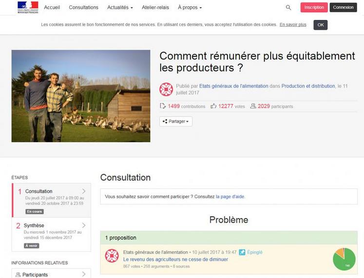 Lancée le 20 juillet, elle s’achèvera à la fin du mois d’octobre.Pour cette première vague, consacrée donc à la création et la production, trois consultations sont ouvertes : «comment rémunérer plus équitablement les producteurs ?», «comment mieux intégrer la réalité des coûts de production ?» et enfin, «comment accompagner la transformation de notre agriculture ?»