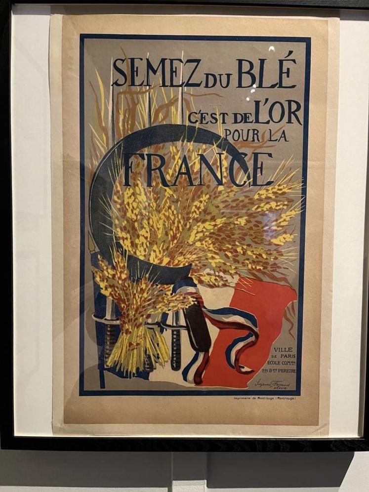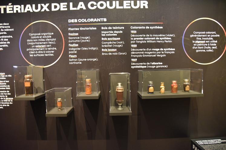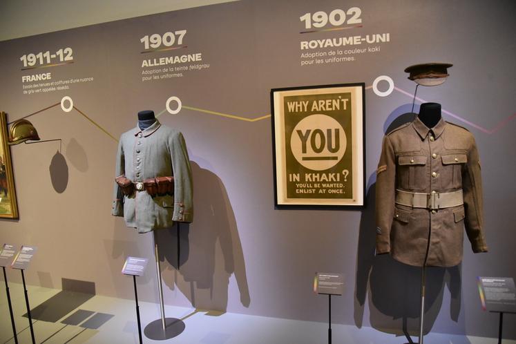 L’exposition, qui débute par une affiche sur les emprunts de guerre réalisée après le conflit, exprime parfaitement le rôle des couleurs : on passe de la guerre en noir à la couleur pour le futur. Longtemps issues de matières naturelles, notamment des végétaux, les couleurs ont évolué au XIXe siècle avec le développement des colorants de synthèse par des chimistes allemands. En France, les producteurs de garance — plante cultivée pour la teinture rouge extraite de ses rhizomes — du Vaucluse ont été ruinés en moins de vingt ans, alors même que cette couleur continuait d’être utilisée pour les pantalons des soldats au début de la guerre.