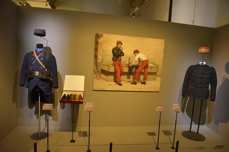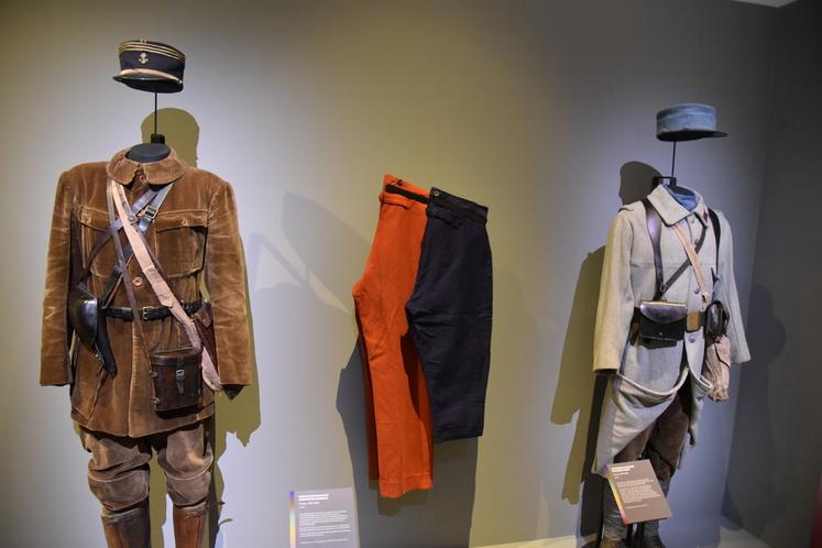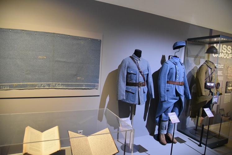Puis le visiteur découvre l’usage des couleurs dans les uniformes. En France, le pantalon garance du début du conflit, jugé trop visible en raison de sa teinte rouge, évolue après différentes réflexions pour aboutir aux tenues bleu horizon dès avril 1915. Cette tenue équipe alors toutes les armées, sauf celles des colonies. L’idée du camouflage n’était pas théorisée avant ce conflit. Elle a souvent émergé grâce aux œuvres des artistes mobilisés.