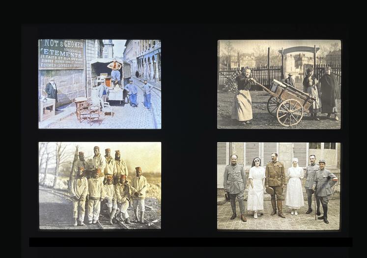 Dans un second espace, des clichés de guerre et de la vie à l’époque, pris selon le procédé de l’autochrome, sont exposés. Cette technique photographique, utilisant de l’amidon de pomme de terre et brevetée par les frères Lumière, permettait d’obtenir des images en couleurs.