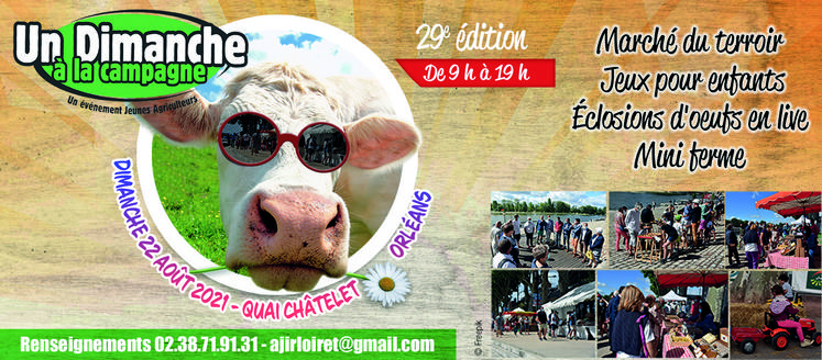 La 29ème édition de l’évènement agricole « Un dimanche à la campagne » aura lieu le dimanche 22 août 2021 sur les quais du Châtelet à Orléans. Organisé par Ajir et JA45, il a pour but de faire découvrir de manière ludique et pédagogique au grand public les différents métiers de l’agriculture.