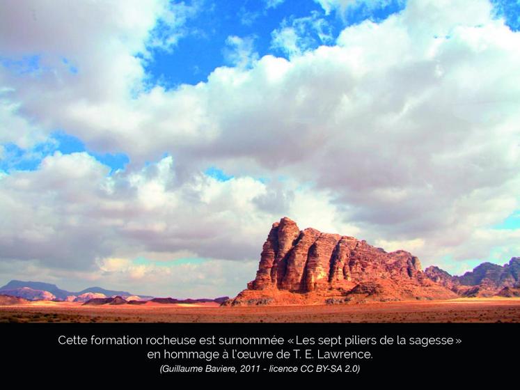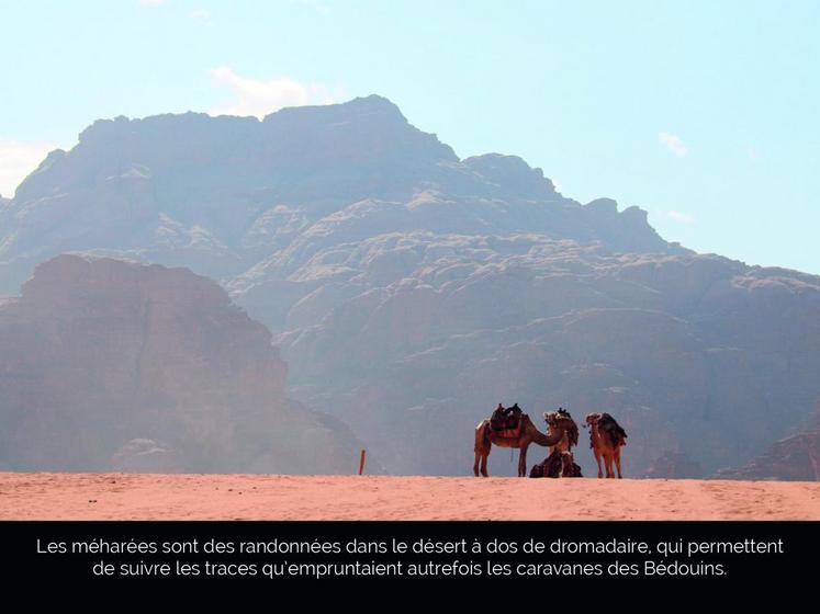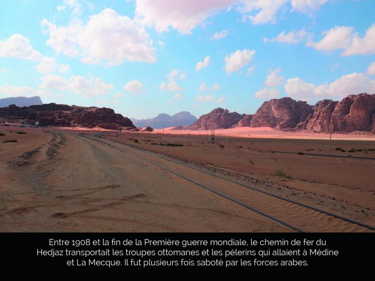 On croise le chemin de fer du Hedjaz, qui reliait Damas à Médine au début du XXe siècle et qui ne transporte plus désormais que des marchandises. Mentionnés dans divers textes grecs et romains puis dans le Coran, les lieux sont quasi-légendaires. Soie, encens et épices transitaient dans le Wadi Rum en caravane avant l’avènement de la marine marchande. Les Hébreux en chemin vers la Terre promise empruntèrent peut-être aussi ces pistes.