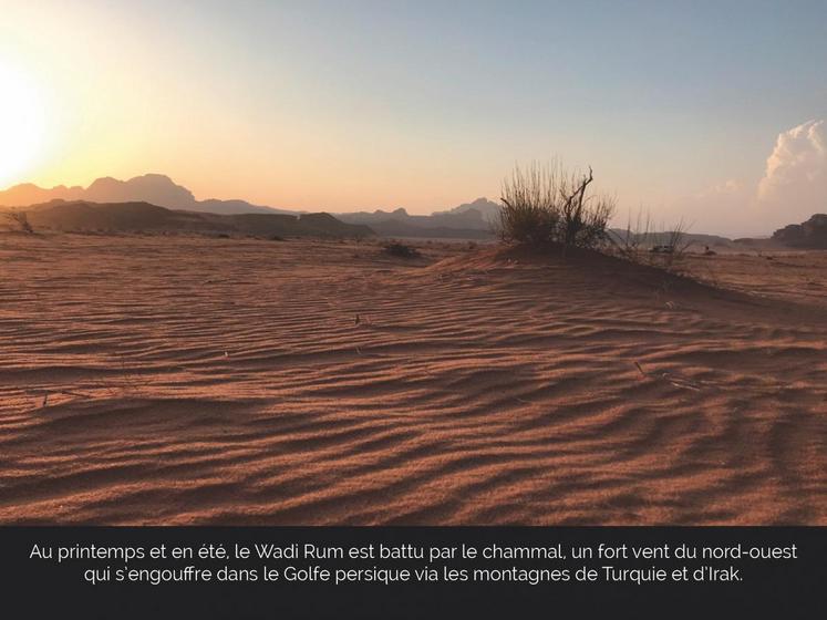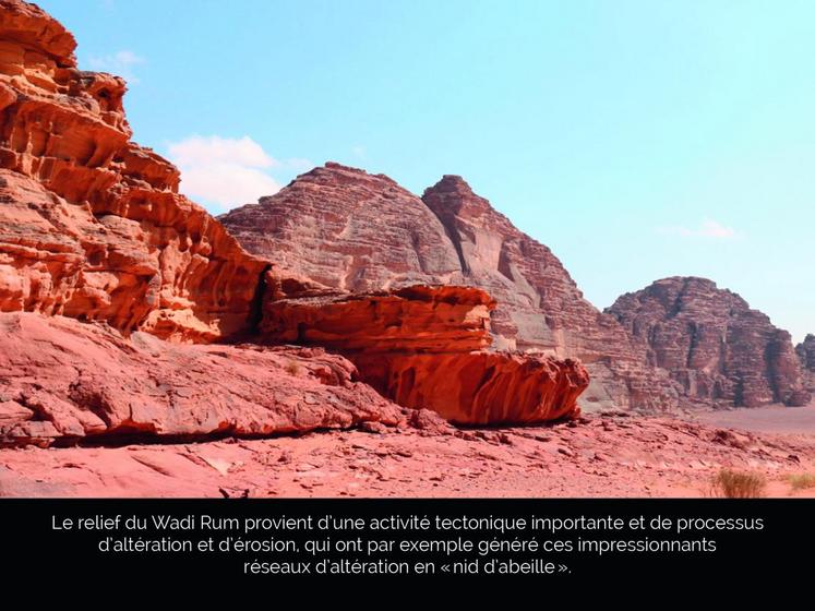 De fait, le Wadi Rum est une vallée, creusée au fil du temps par l’érosion d’un cours d’eau dans des rochers de grès et de granite, puis devenue aride lorsque le climat s’est asséché, au IIIe millénaire avant J.-C. De colossales formations de grès ocre — la plus haute, Jebel Rum, culmine à 1 734 mètres — surplombent de vastes dunes de sable rose ou doré.