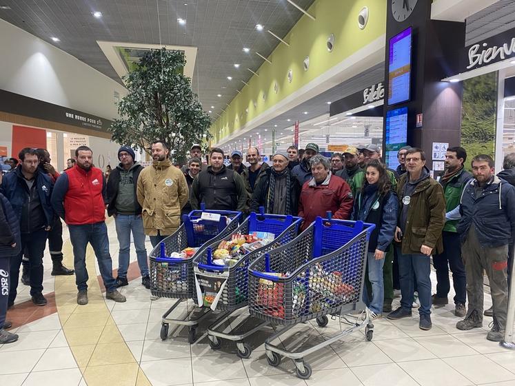La manifestation s’est poursuivie au sein des grandes surfaces. Un convoi de tracteurs s'est rendu au Leclerc de Blois, et un autre au Grand Frais de la même ville, situé en face du magasin de producteurs O’pré des paysans. Au Leclerc, les agriculteurs ont pénétré au sein du magasin pour coller des étiquettes sur les produits avec des matières premières n’étant pas d’origine française. Des champignons de Paris issus de Pologne, des saucisses de Toulouse de provenance UE ou encore des fruits et légumes venant de partout sauf de France ont reçu une étiquette « On marche sur la tête ». Quentin Huet, président du magasin Leclerc Blois, a reconnu comprendre la colère des agriculteurs et les soutenir sans pour autant avoir de solutions à leur proposer : « Je partage votre opinion et je ne peux être que d’accord avec vous. Je vous propose que nous puissions nous revoir dans un contexte plus serein afin de discuter tous ensemble ». En seulement une demi-heure, trois chariots ont été remplis de produits ne provenant pas de France, sans réellement surprendre les adhérents des deux syndicats agricoles. « Tout cela, ce sont des produits qui ne sont pas d’origine française ? Même le pâté de volailles ? », s’est toutefois étonnée une consommatrice présente dans le magasin.