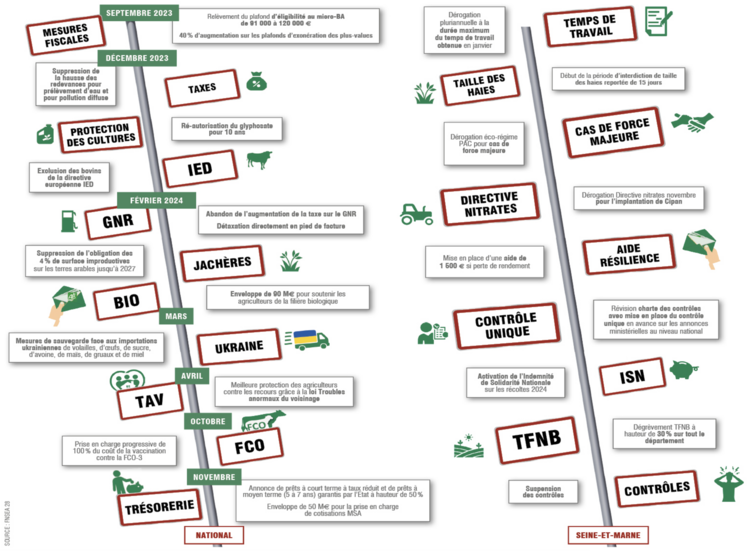 Après une année de mobilisation débutée avec le retournement des panneaux d’entrée de ville en novembre 2023, nous revenons sur les acquis obtenus grâce à la mobilisation et aux négociations des syndicats FNSEA et Jeunes agriculteurs au niveau national et plus localement, en Seine-et-Marne.