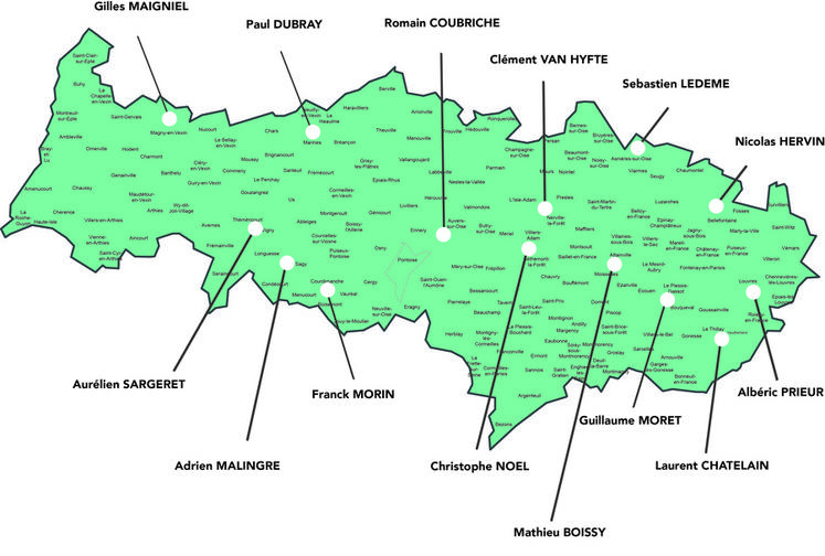 Retrouvez ci-dessous la carte avec les localisations des référents du Val-d'Oise afin d’identifier rapidement le contact dédié.