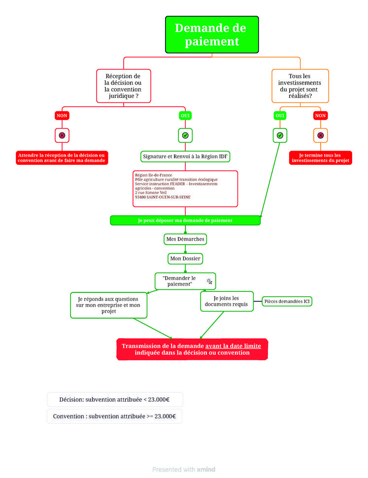 La demande de paiement doit être déposée après avoir réalisé tous les investissements et avant la date limite prévue par la convention ou la décision juridique. Il ne faut pas déposer de demande de paiement tant que vous n’avez pas reçu la décision juridique ou la convention, sinon la demande sera rejetée.