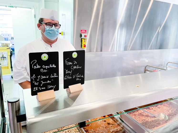 « Notre objectif à la ferme est de produire pour la population. Nous produisons de la viande bovine et des céréales, des légumineuses et du chanvre en bio. Le chanvre est un peu notre spécialité, nous le transformons en huile, farine, graines, isolant et même en pâtes. Nous avons ouvert un magasin à la ferme. Les gens s'intéressent de plus en plus à ce qu'ils mangent. Pour nous, le local c'est tout ce que l'on peut livrer nous-mêmes. Ici, au collège, je livre de la viande depuis un an. C'est bien qu'il y ait des chefs qui savent utiliser et valoriser nos produits. Si au départ ça paraît plus cher, si c'est bien travaillé, ça devient intéressant. Néanmoins, l’utilisation d’Agrilocal n'est pas évidente pour nous. Il faut répondre à l'appel d'offres, attendre que ce soit validé et livrer deux jours après… Pour notre façon de fonctionner, c'est trop court. S'ils veulent que les éleveurs soient plus présents, il faut changer ça. Il y aurait aussi beaucoup de choses à faire au niveau des céréales et des légumineuses. Il faut réapprendre à utiliser ces produits ». On trouve aussi les produits de la Ferme du Chailloué en Eure-et-Loir aux Jardins d'Imbermais et aux Jardins des Célestins (Broué).