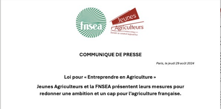 "Jeunes Agriculteurs et la FNSEA présentent leurs mesures pour redonner une ambition et un cap pour l’agriculture française.