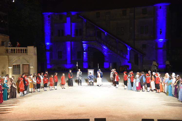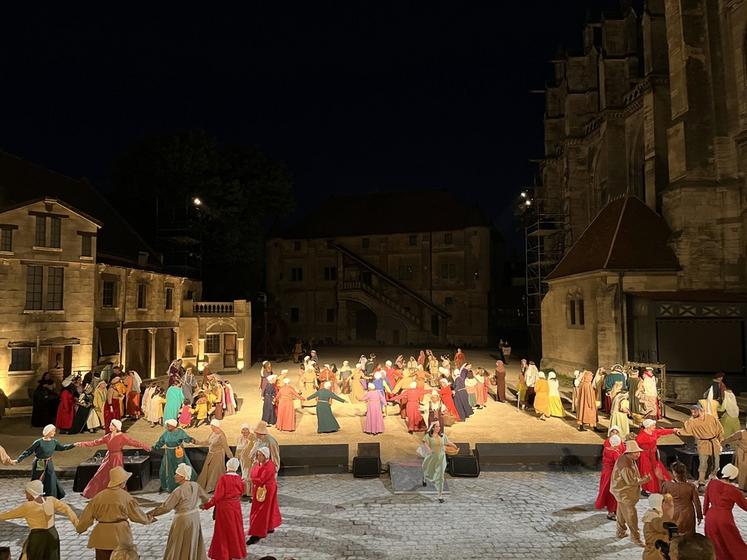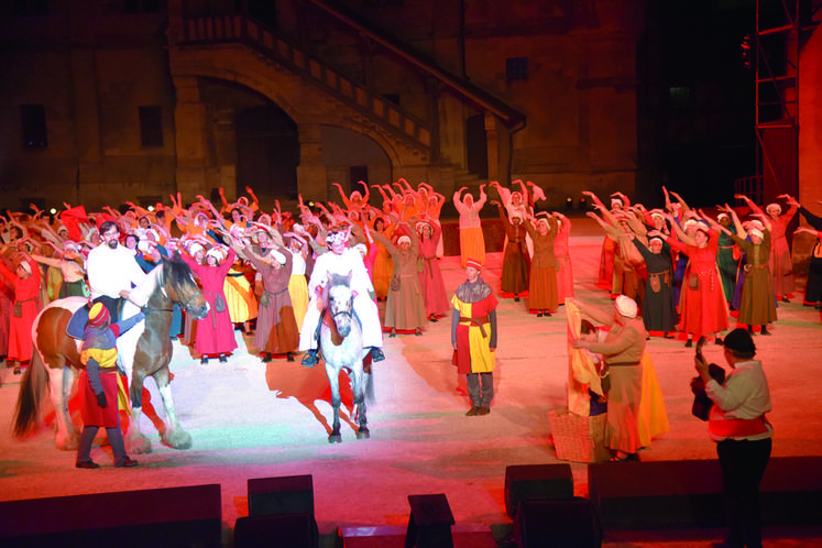 Ce spectacle est aussi une grande aventure humaine réunissant 500 bénévoles (comédiens, danseurs, musiciens, cavaliers…) dont près de 400 acteurs sur scène qui revêtent 2 500 costumes — la cathédrale Saint-Etienne étant transformée en vestiaire. Plusieurs générations d’une même famille sont parfois bénévoles. L’ensemble est illuminé de 900 projecteurs auxquels s’ajoutent du mapping vidéo et 300 jeux de lumière, le tout rythmé par des musiques adaptées.