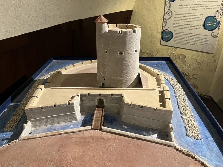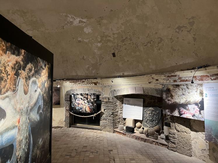 Dans un second temps, on accède à la salle voûtée de la tour, aérée et éclairée par un oculus, où sont présentées des expositions temporaires. Cet été, l’exposition Vivre en pieuvre de Franck Bessières y était proposée.
