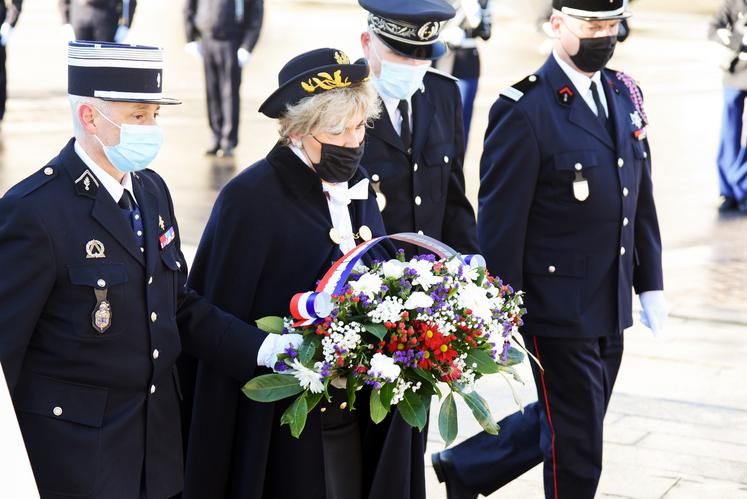Comme le veut la tradition, elle a déposé une gerbe au Monument aux Morts, Butte des Charbonniers et une autre devant la stèle Jean Moulin, place de la Résistance, avant de rencontrer la presse.