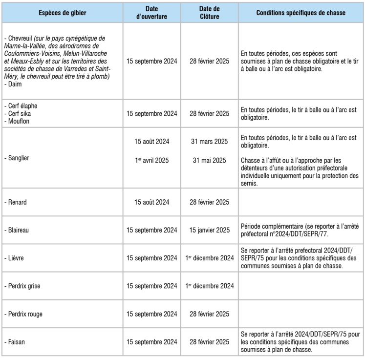 Dates d'ouverture, de fermeture et conditions de chasse pour la campagne 2024-2025