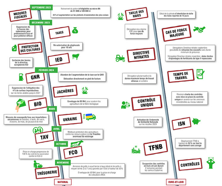 Après une année de mobilisation débutée avec le retournement des panneaux d’entrée de ville en novembre 2023, nous revenons sur les acquis obtenus grâce à la mobilisation et aux négociations des syndicats FNSEA et Jeunes agriculteurs au niveau national et plus localement, en Eure-et-Loir.