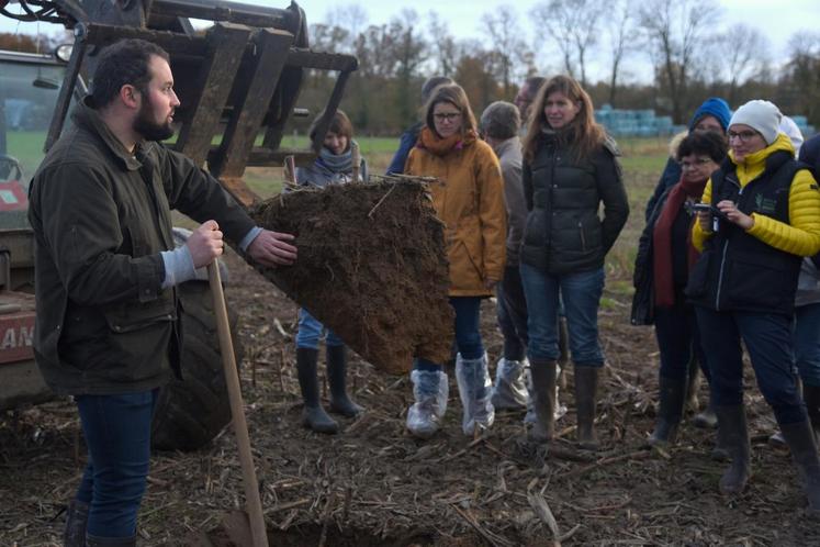 Puis tout le monde est allé voir sur le terrain deux profils de sols exemplaires, détaillés par Vincent Rigal, de la chambre d’Agriculture de Loir-et-Cher : « Ce qui se passe en dehors du sol est corrélé à ce qui se passe en dessous. Là, il n’y a rien à dire, c’est du bon boulot », a-t-il constaté devant les mottes de terre extraites du sol de deux parcelles.