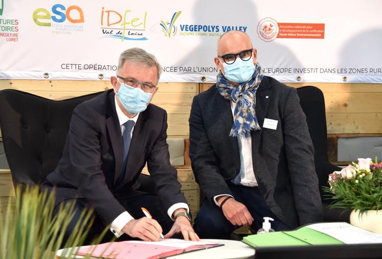 François Bonneau, président de Région, et Jean-Luc Parou, président de l'association HVE Beauce-Val de Loire, signant l'engagement de la région envers ce collectif HVE.