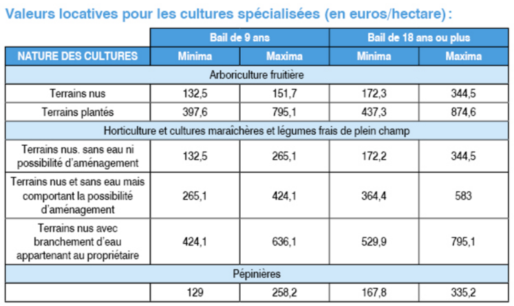 Depuis le 1er octobre 2024, les maxima et les minima représentant les valeurs locatives normales à l’hectare de terres non logées sont fixés en monnaie aux valeurs actualisées (en euros/hectare) indiquées dans ce tableau :