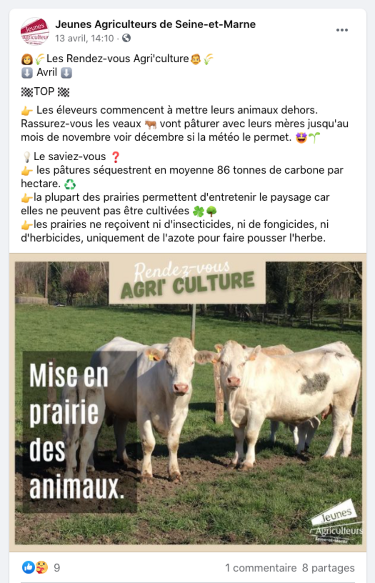 En 2021, le groupe poursuit sa communication sur Facebook à travers des « rendez-vous Agri’cultures » tout au long de l’année pour présenter l’activité des agriculteurs une à deux fois par mois (reliquats azotés, semis des pois, de l’orge et de betteraves ont déjà fait l’objet de publications par exemple) et des publications sur les filières en lien avec des événements comme celle sur l’agneau d’Île-de-France pour Pâques.