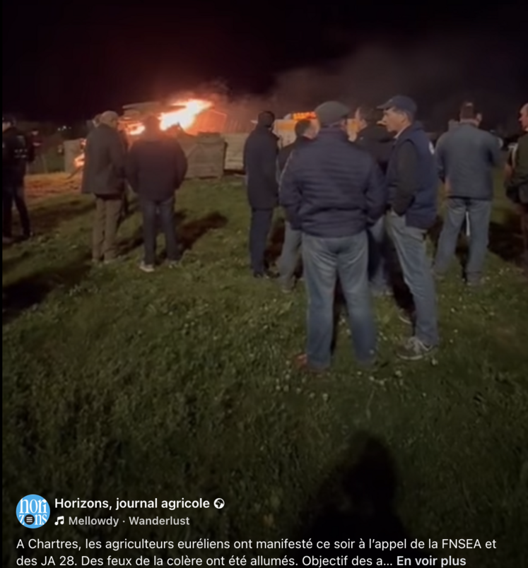 Jeunes agriculteurs et la FNSEA d'Eure-et-Loir ont allumé des feux de la colère mercredi 12 novembre pour montrer leur opposition à l'instauration du MACF*, à la signature du Mercosur et pour dénoncer les dérives de la future Pac.