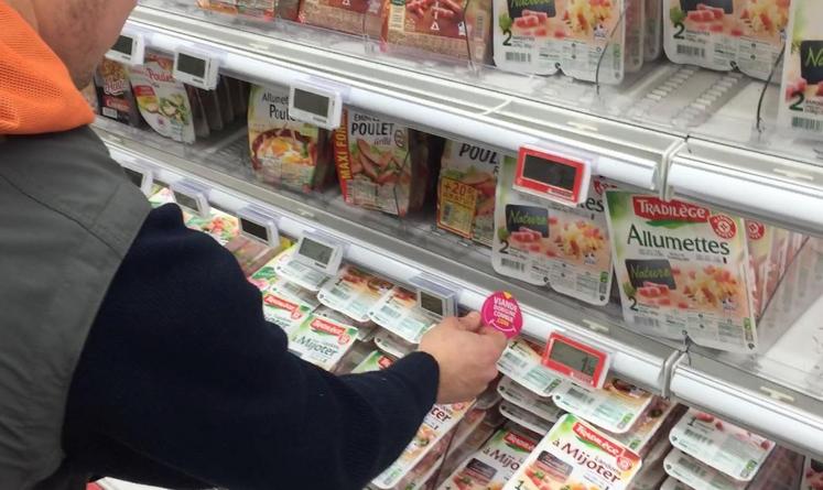 Répartis dans différents rayons, les Jeunes agriculteurs ont étiqueté plusieurs produits : une étiquette « viande d’origine connue » pour les produits dont la provenance est clairement mentionnée et une autre, « viande de nulle part », pour les produits dont l’origine est mal ou pas du tout indiquée.