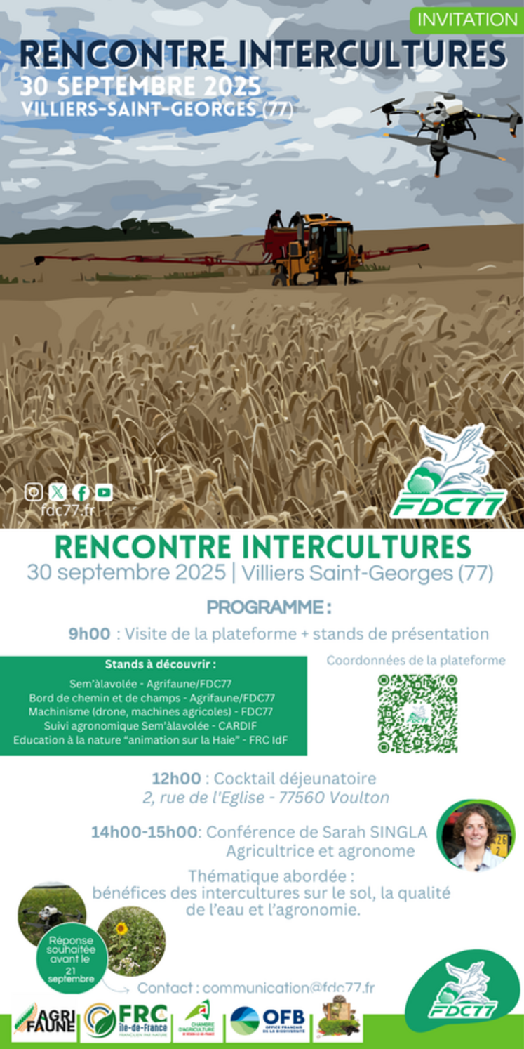 Afin de faire le point sur Sem'àlavolée, une innovation en faveur de la biodiversité et de l'agriculture en Seine-et-Marne, une journée découverte Rencontre intercultures est organisée mardi 30 septembre à partir de 9 heures à Villiers-Saint-Georges, sur une plateforme expérimentale. La matinée sera consacrée à la visite de la plateforme et à sa présentation. Au programme : présentation de Sem'àlavolée et Sem'obord (pour les bords de chemins et de champs) par Agrifaune et la FDC 77, du machinisme (drone, machines agricoles) avec la FDC 77, suivi agronomique animé par la chambre d'Agriculture de région Île-de-France, et éducation à la nature par la Fédération régionale des chasseurs (FRC Île-de-France), notamment sensibilisation sur la haie. À l'issue d'un cocktail déjeunatoire, l'après-midi sera consacré à une conférence de Sarah Singla, agricultrice et agronome, sur les bénéfices des intercultures pour le sol, la qualité de l’eau et l’agronomie.