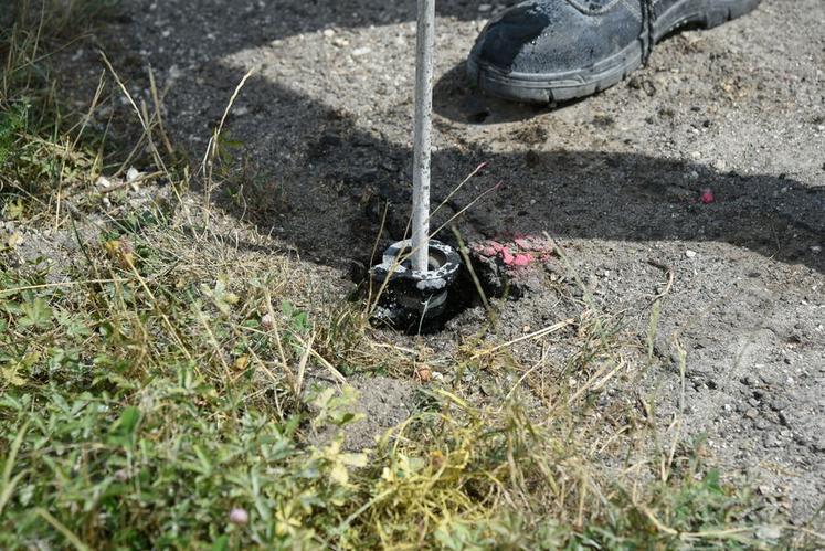 Afin d'injecter le bio-ciment dans les sols, plusieurs forages sont nécessaires. Sur 230 mètres de la route départementale 151, plusieurs forages de 4 centimètres de diamètre s'enfoncent jusqu'à 2 mètres de profondeur pour atteindre la zone argileuse des sols. « Une fois les forages effectués, nous insérons un tube afin d'y injecter le produit à faible pression pour ne pas créer de dégât dans le sol, précise Sten Rettby, chef de projet pour l’entreprise Medusoil. Six cycles d’injection permettent ensuite au produit de se diffuser dans le sol ». Au total, 30 litres de produit seront injectés dans chaque forage. Composée à 100 % de produits naturels, cette solution « n'est pas censée se transmettre vers les sols des cultures, rassure l'expert. Le produit a été contrôlé et certifié par les organismes environnementaux habilités ».
