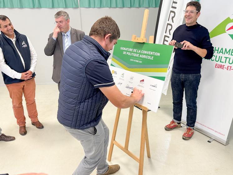 Les deux présidents ne sont pas seuls à signer. Le président de Terres d'Eure-et-Loir, Matthieu Bonnet, qui a annoncé qu'il y aurait de nouveau un grand marché de producteurs au château de Maintenon au printemps prochain, celui d'Aidagri, Pascal Laya, qui rappelle que les agriculteurs traversent une période complexe avec un risque d'isolement réel, et celui de Jeunes agriculteurs, Sylvain Marcuard, paraphent leurs conventions respectives (voir également ci-dessous).