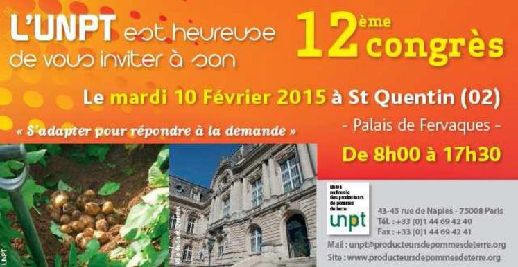 Le prochain Congrès de l’UNPT aura lieu le mardi 10 février 2015 au Palais de Fervaques, à St Quentin (02). Il est organisé avec l’appui de l’USAA, le soutien du Conseil Général de l’Aisne, et en partenariat avec les acteurs de la filière pomme de terre de l’Aisne. Le thème principal sera : «S’adapter pour répondre à la demande»