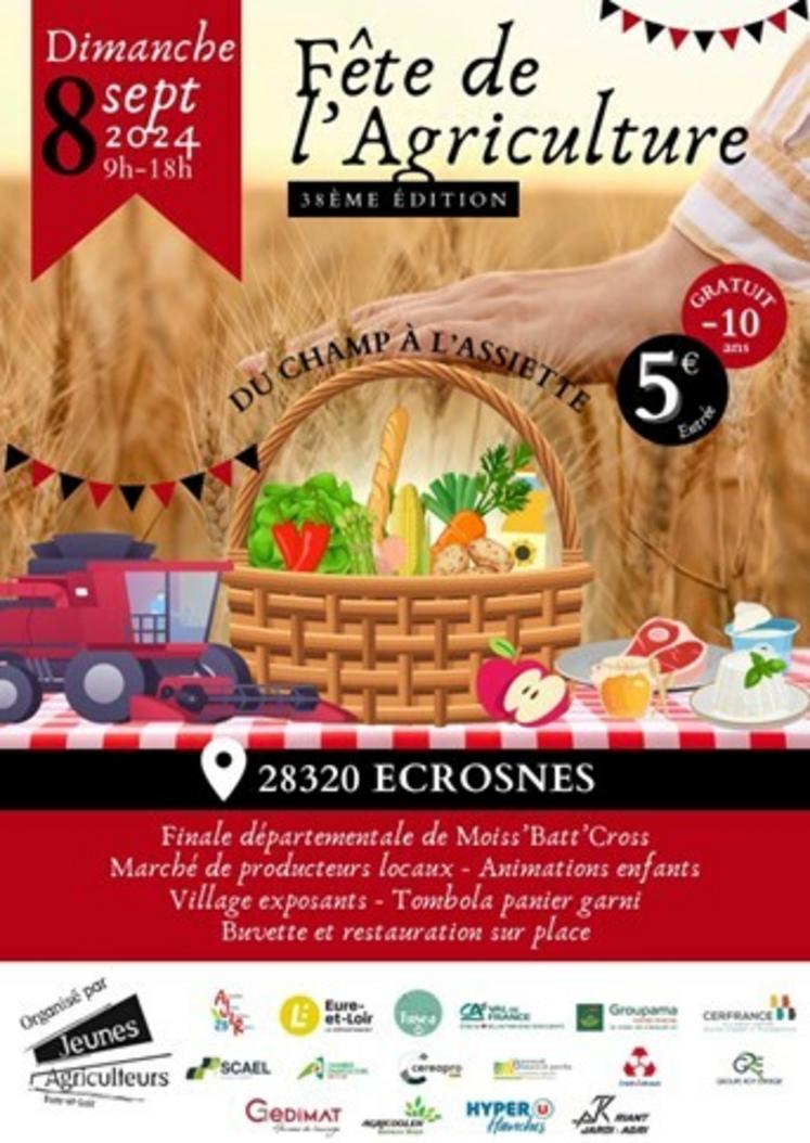 Le dimanche 8 septembre aura lieu à Écrosnes la trente-huitième édition de la Fête de l’agriculture, organisée par Jeunes agriculteurs d’Eure-et-Loir. Des animations viendront rythmer la journée, moiss'batt cross, marché de producteurs locaux, village exposants, animations pour les enfants…