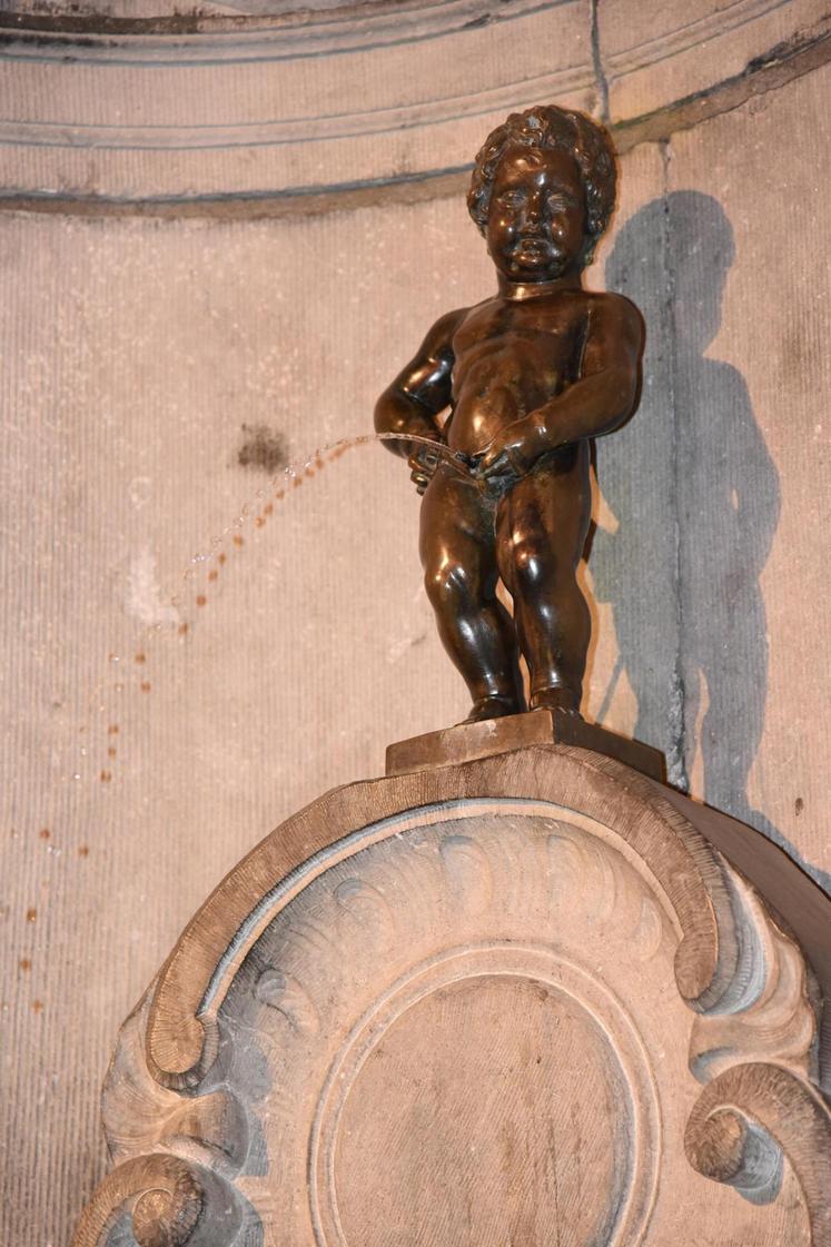 De la Grand-Place on arrive rapidement aussi à une célébrité bruxelloise : le Manneken-Pis, petit bronze de 55,5 cm datant du XVIIe siècle, qui passe son temps à uriner devant des touristes amusés, en particulier les enfants. En fonction d’un calendrier déterminé, il est revêtu certains jours de tenues d’apparats, choisies parmi les huit cents vêtements et accessoires qu’il possède.