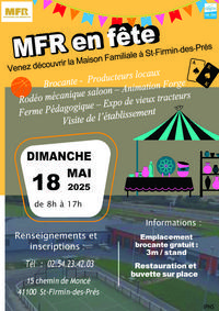 La prochaine visite de l'établissement, pour ceux qui n'auraient pas assisté aux portes ouvertes du 22 mars dernier, sera le dimanche 18 mai lors de MFR en fête. MFR en fête se déroulera de 8 heures à 17 heures dimanche 18 mai au sein des locaux de la MFR du Vendômois à Saint-Firmin-des-Prés.
