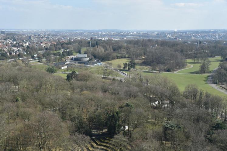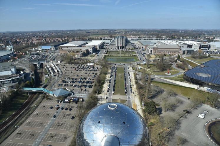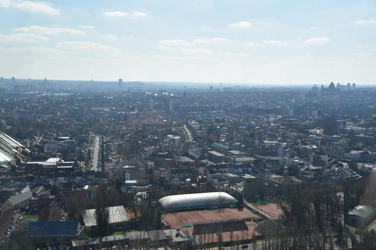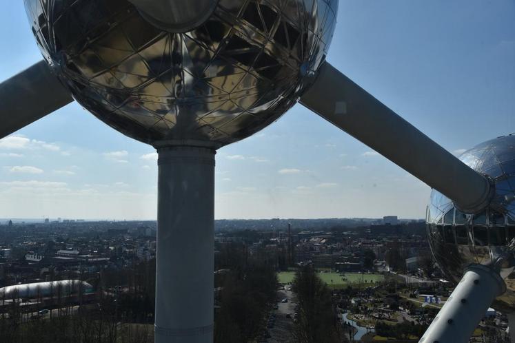 Enfin, dans le tube central se trouve un ascenseur — qui va à la vitesse de cinq mètres/seconde, le plus rapide au monde lors de son installation — permettant d’atteindre le sommet pour découvrir une vue panoramique sur la capitale belge.